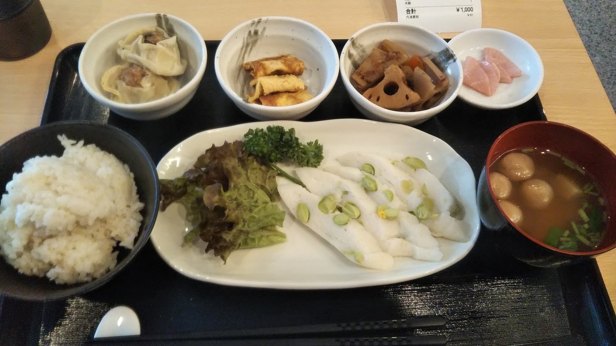 私はメインを魚(はんぺん)、小鉢は③しゅうまい④ねぎ玉子⑤れんこん、ご飯は玄米を選びました。5分程で料理が運ばれてきました。