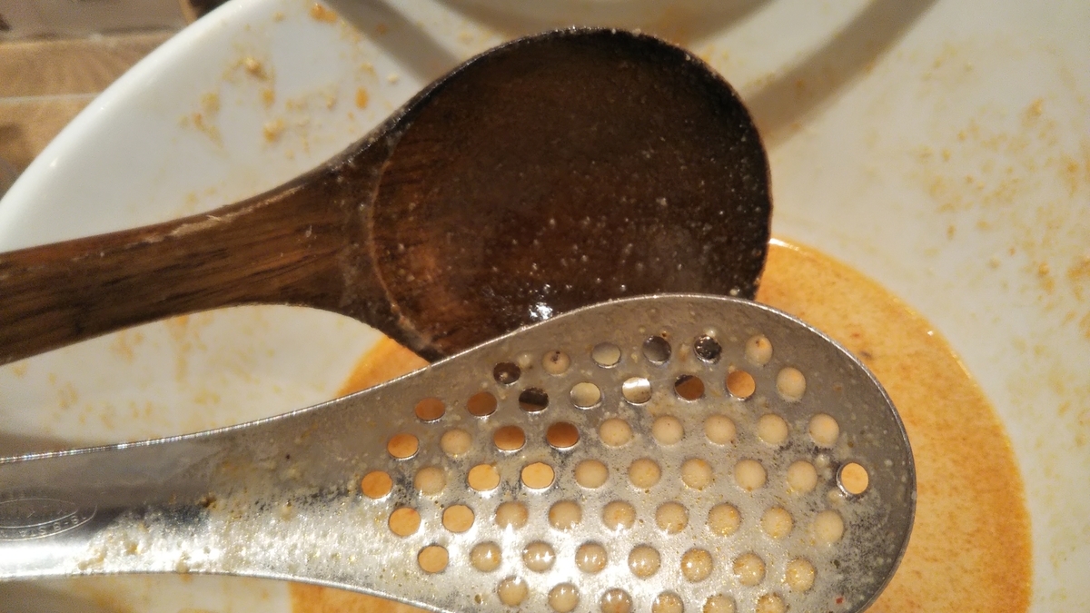 ↑レンゲが2つあって、穴開きの方を使えば、スープは残して具材だけ食べきることができました。
