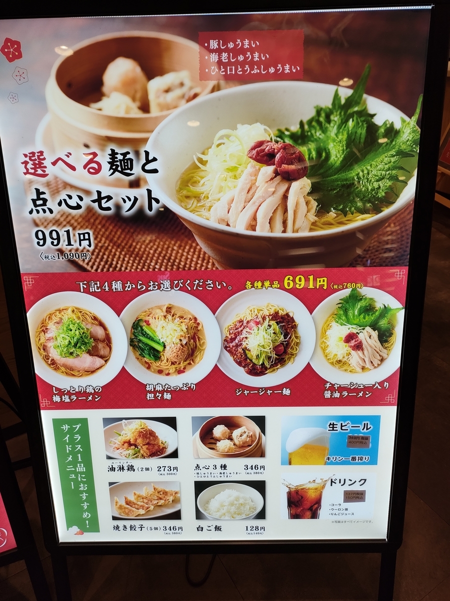 食べてみた感想ですが、麺は少し硬めでツルツルシコシコとはかけ離れた食感で美味しく感じませんでした。塩ラーメンのスープと梅の相性は良かったです。脂くどくなくサッパリした感じで美味しいです。点心の中では豚しゅうまいが美味しかったです。