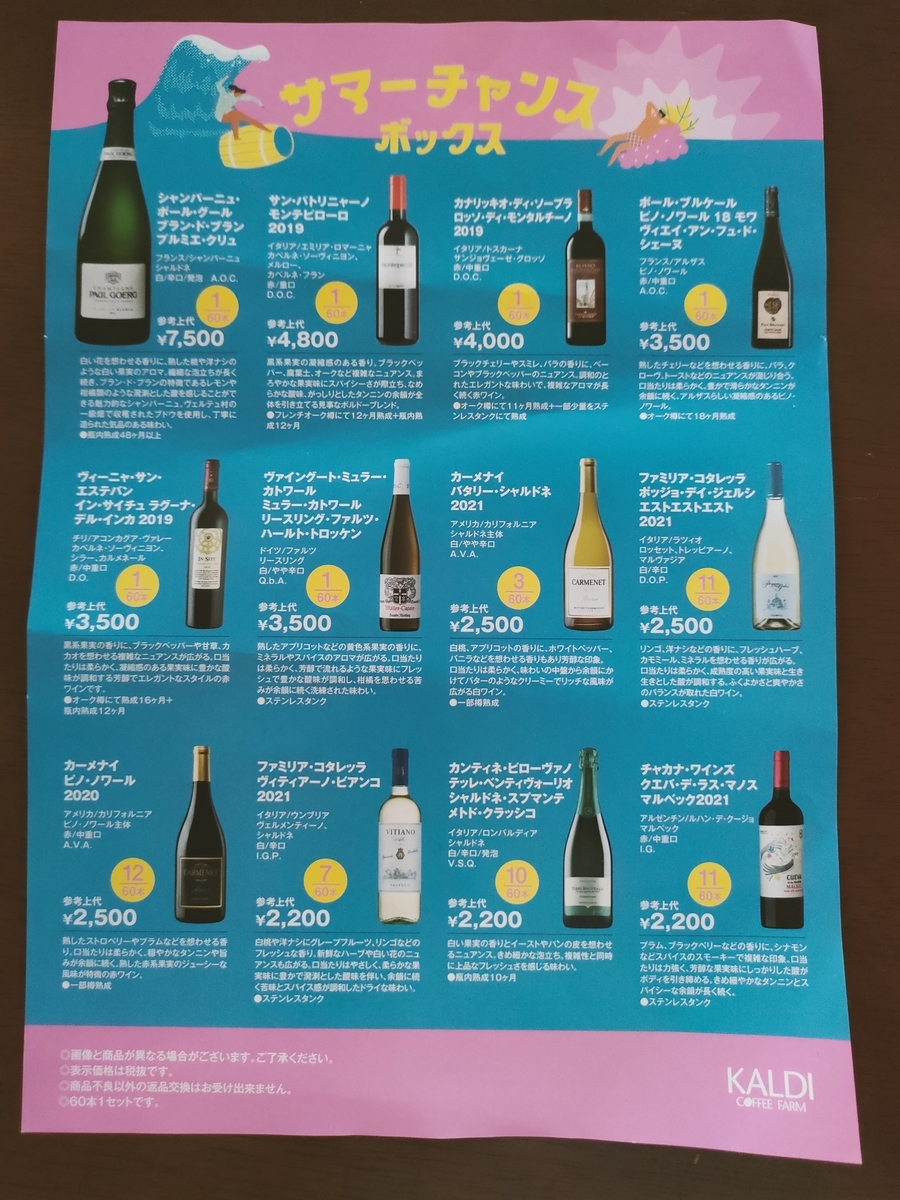 このブログでKALDI商品紹介の第54弾です。今回は「サマーチャンスボックス」というワインの福袋です。私がよくいく店舗で、たまたま発見しました。