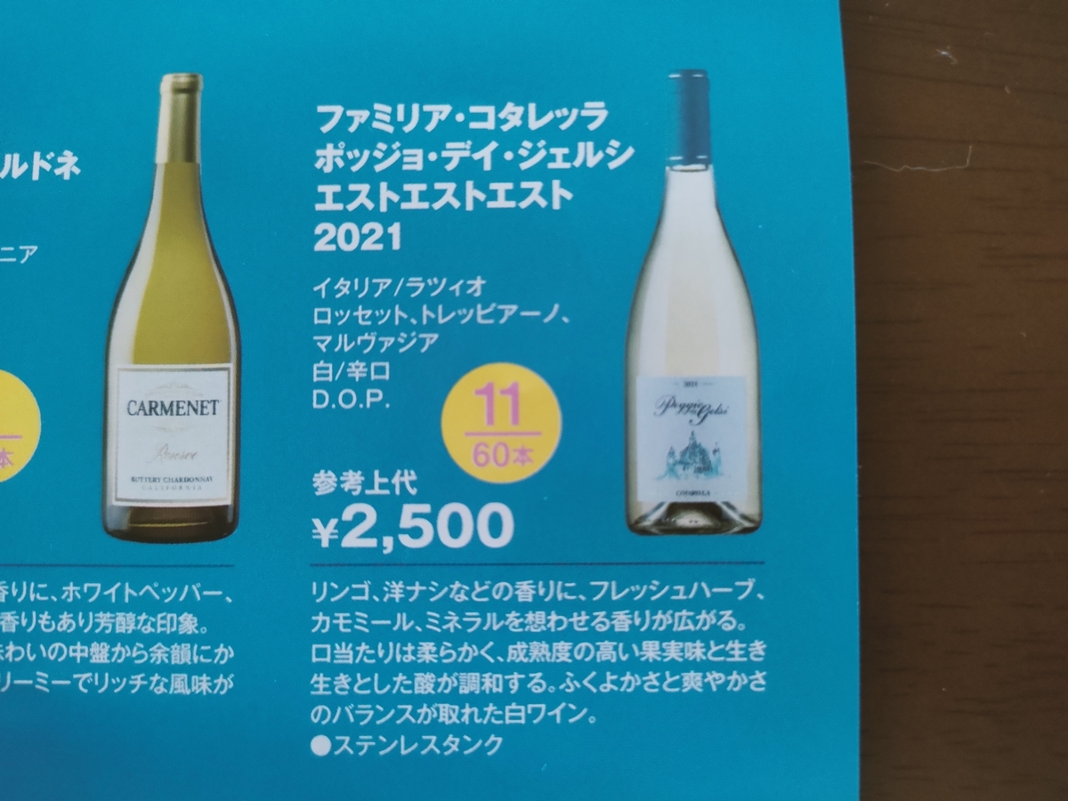 ↑イタリアの白ワインのようです。一番安いものではなかったけど、残念ながら60本中11本入っている「その他大勢」でした。