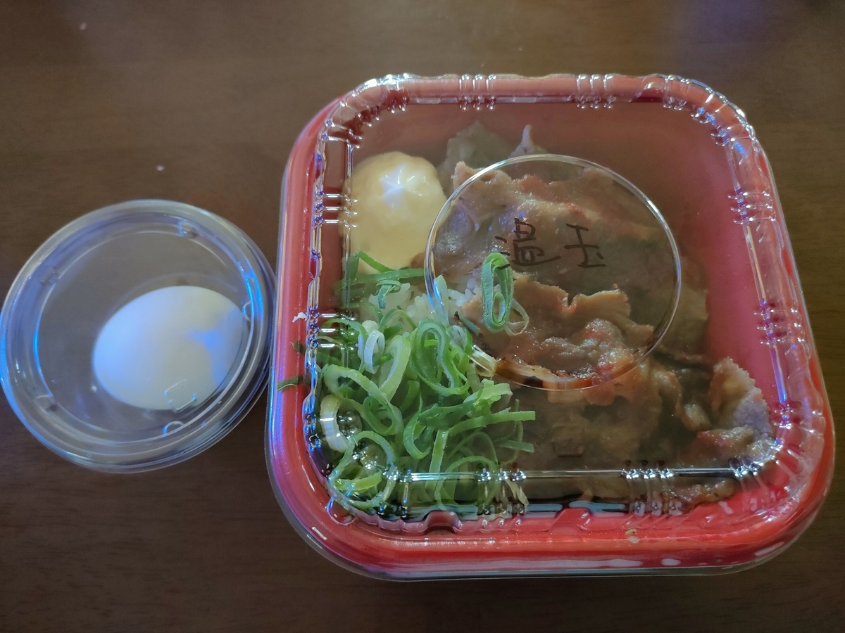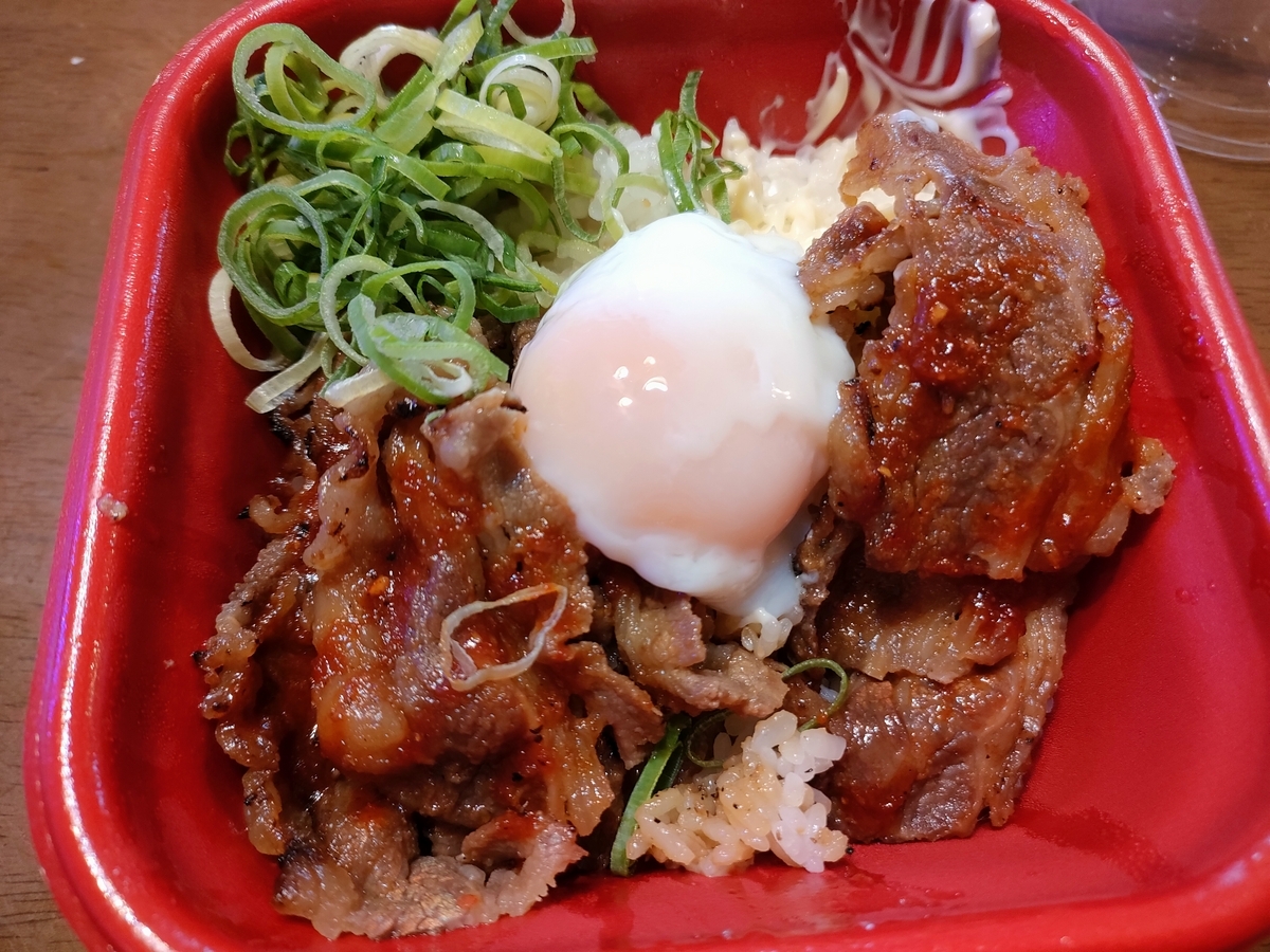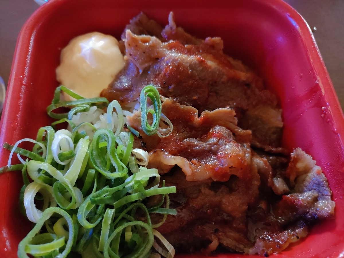 ↑ご飯の上にカルビ、ネギ、マヨネーズがのっています