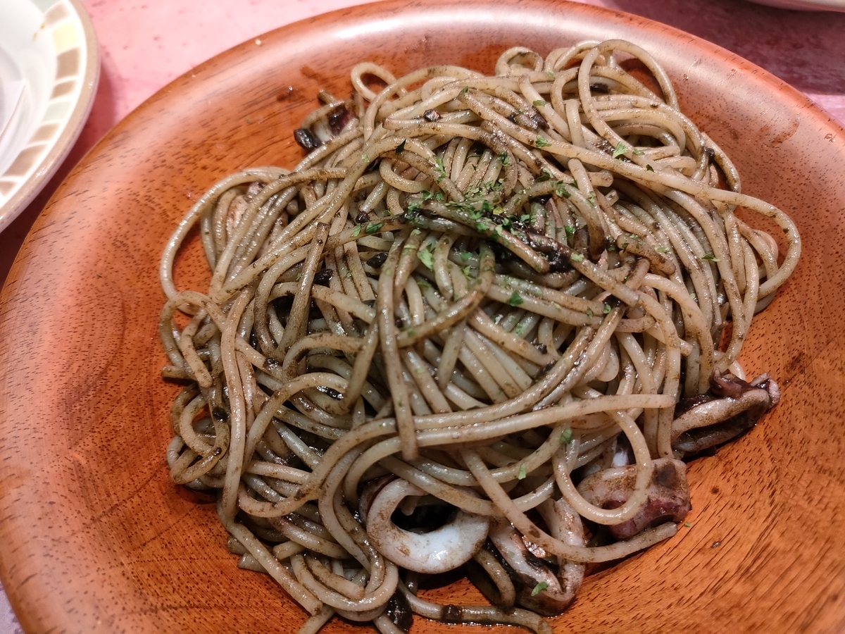 初めて食べました。色も味も薄いので普通のイカ墨のパスタとは違うのかな?イカ墨の独特の旨味が少なく、残念でした。