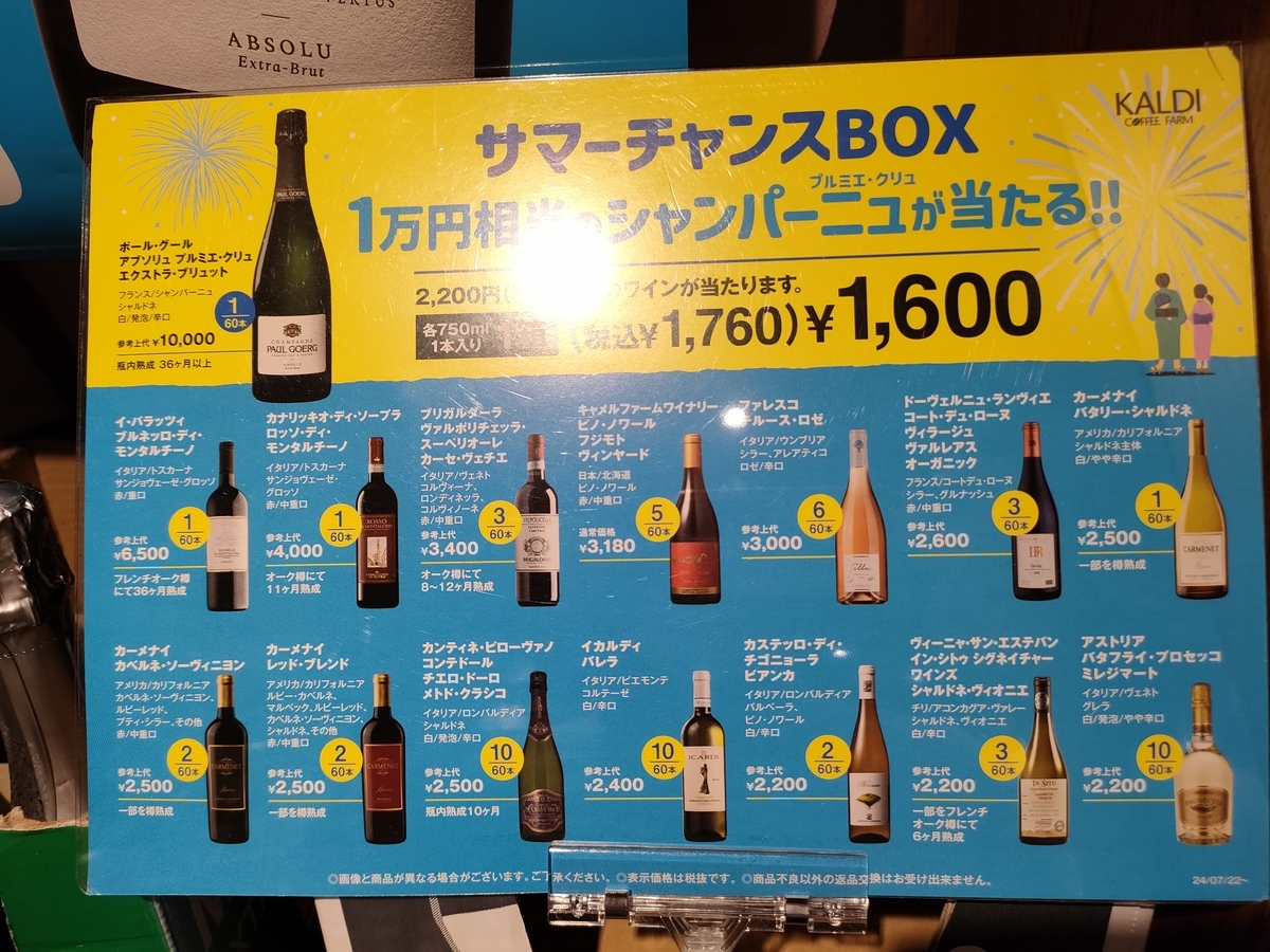 このブログでKALDI商品紹介の第61弾です。今回は「サマーチャンスボックス」というワインの福袋です。昨年に引続き2年連続で購入しました。