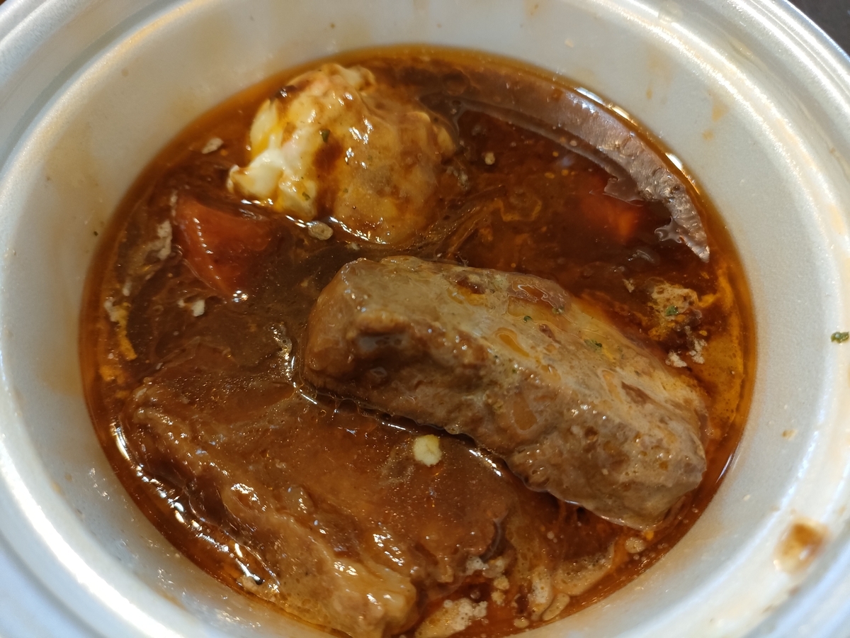 電子レンジで温めて食べた感想は、シチューのようなトロミはあまりなく、スープに近い感じですが、味自体はコクがあって、とても美味しかったです。昨年と変わっていない気がします。牛肉は昨年トロトロだった気がしますが少し硬くなったかな?でも十分柔らかいです。新登場のドフィノワーズは初めて食べましたが、チーズをまとったジャガイモでした。